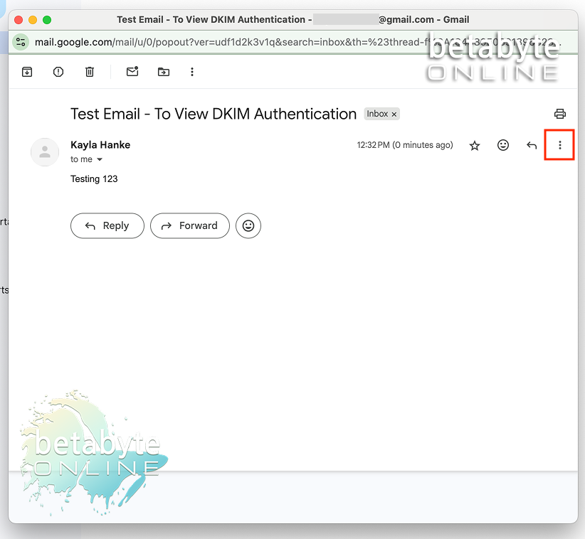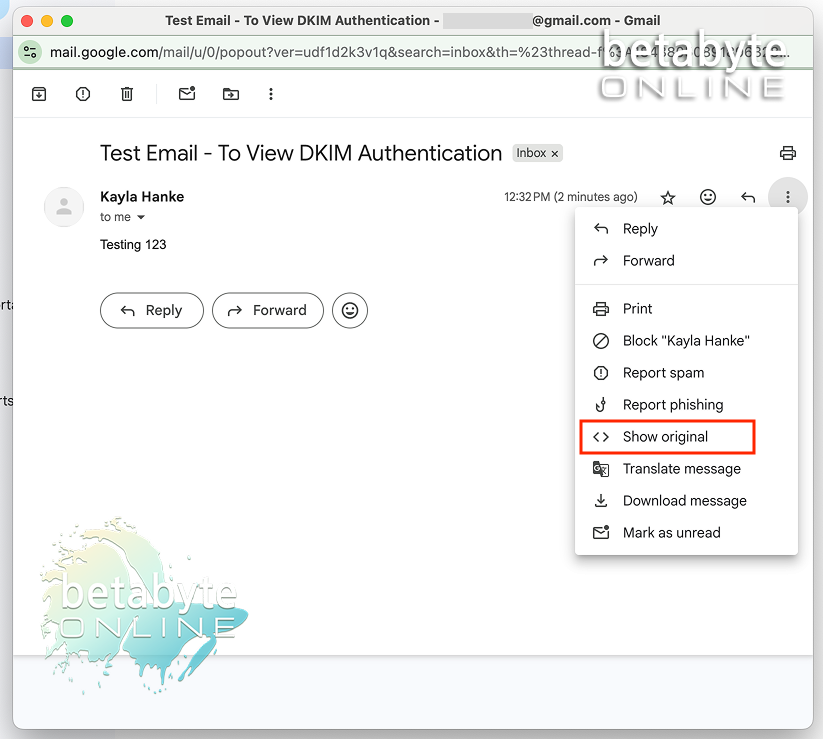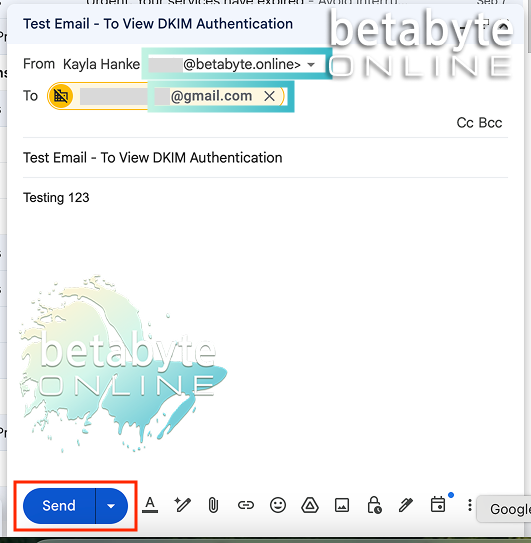 After enabling DKIM and updating your DNS records, send a test email from your domain (for example, you@betabyte.online) to an external Gmail account that you own or can access.