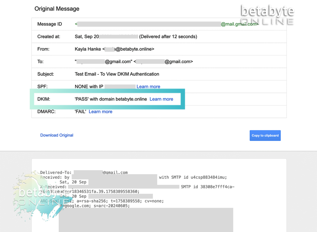 It’s important to send this message to an account outside your domain. Sending an email to yourself within the same domain (like you@betabyte.online to another @betabyte.online address) can bypass certain authentication checks, giving a false impression that your DKIM setup is working correctly.